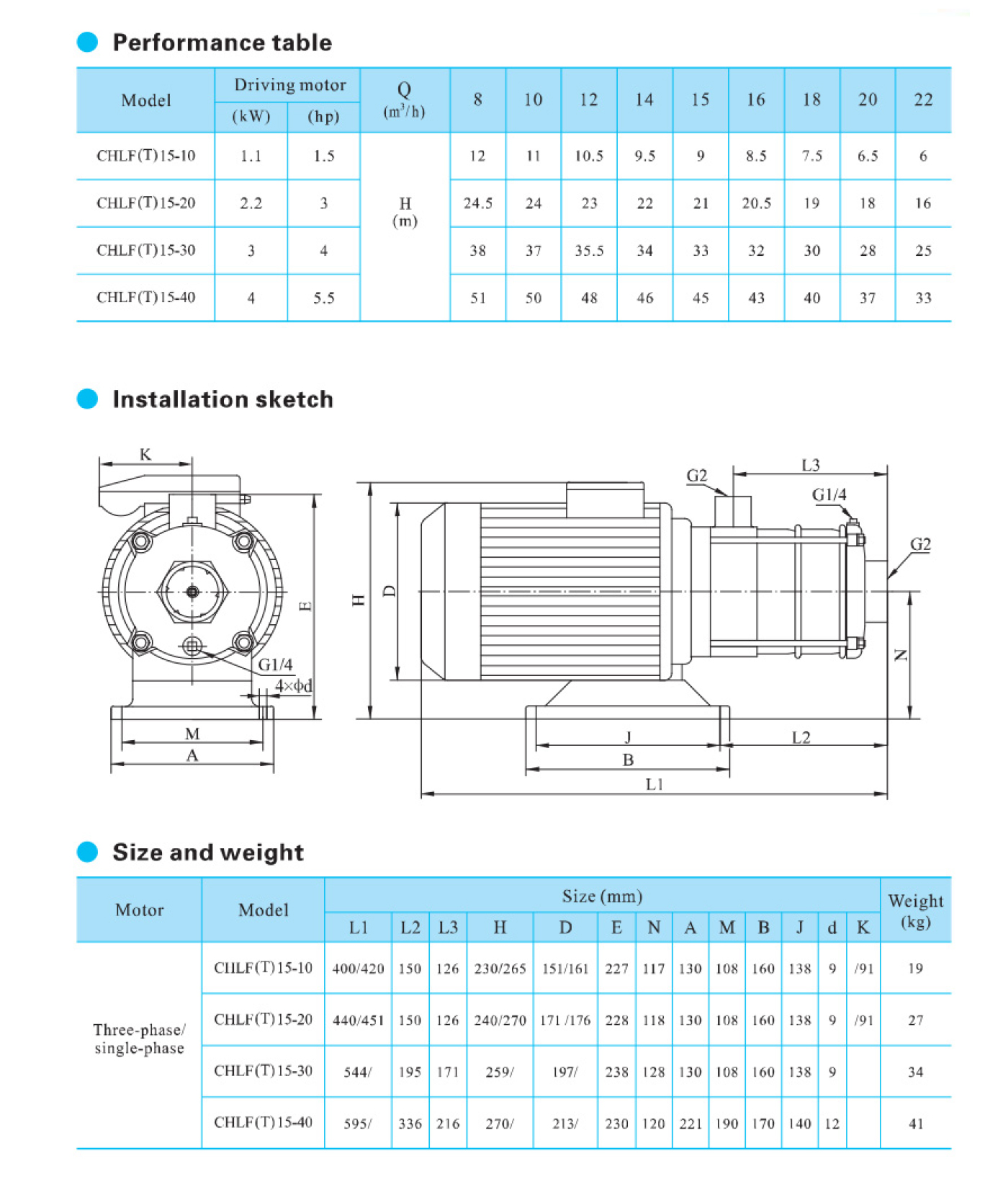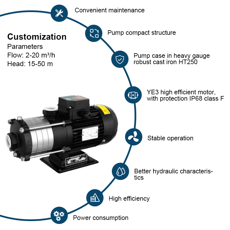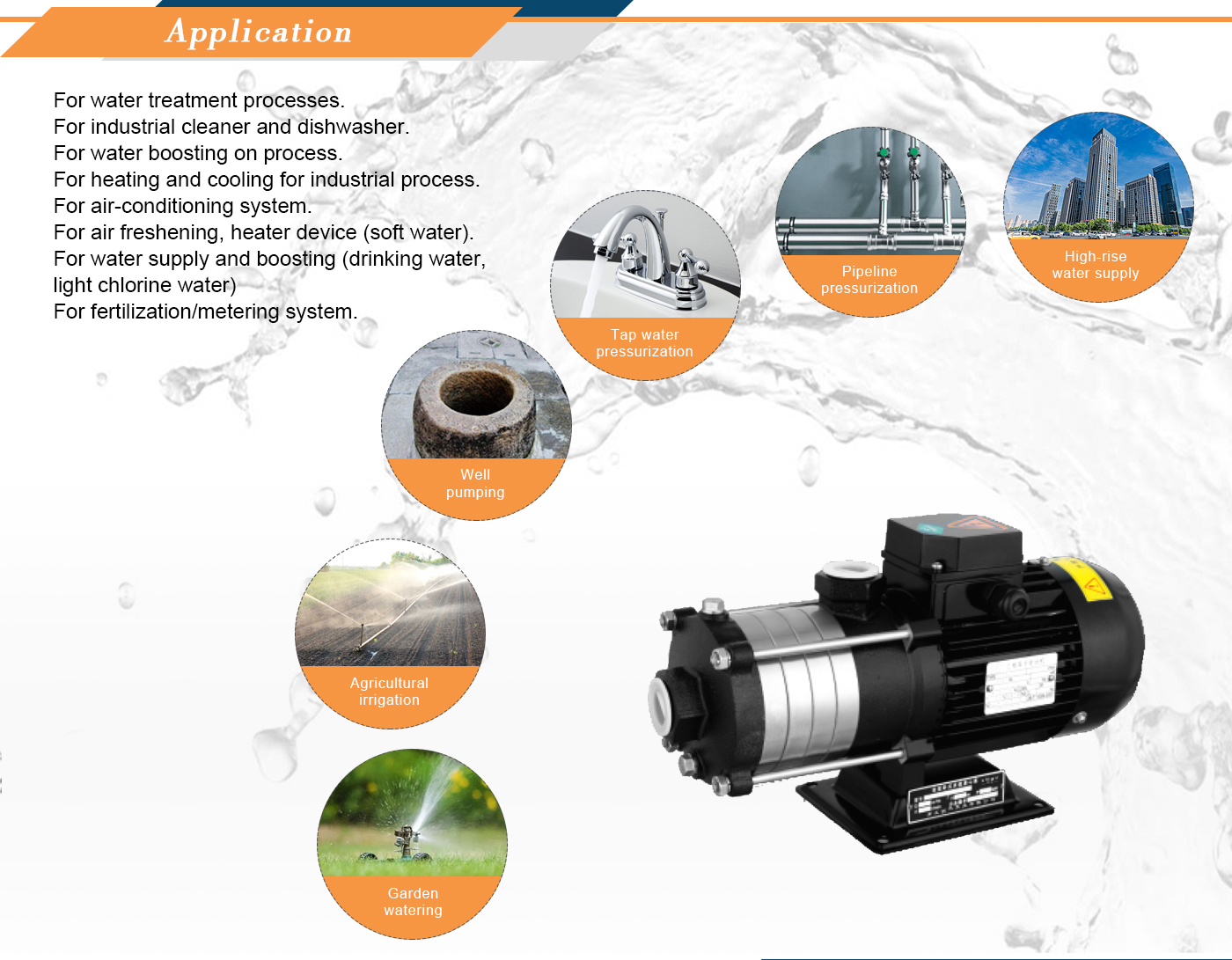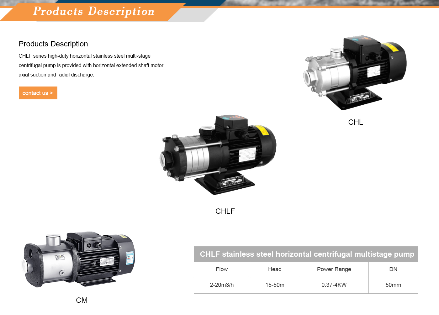 La pompe centrifuge multicellulaire horizontale en acier inoxydable à haut rendement de la série CHLF est équipée d'un moteur à arbre allongé horizontal, d'une aspiration axiale et d'une décharge radiale.