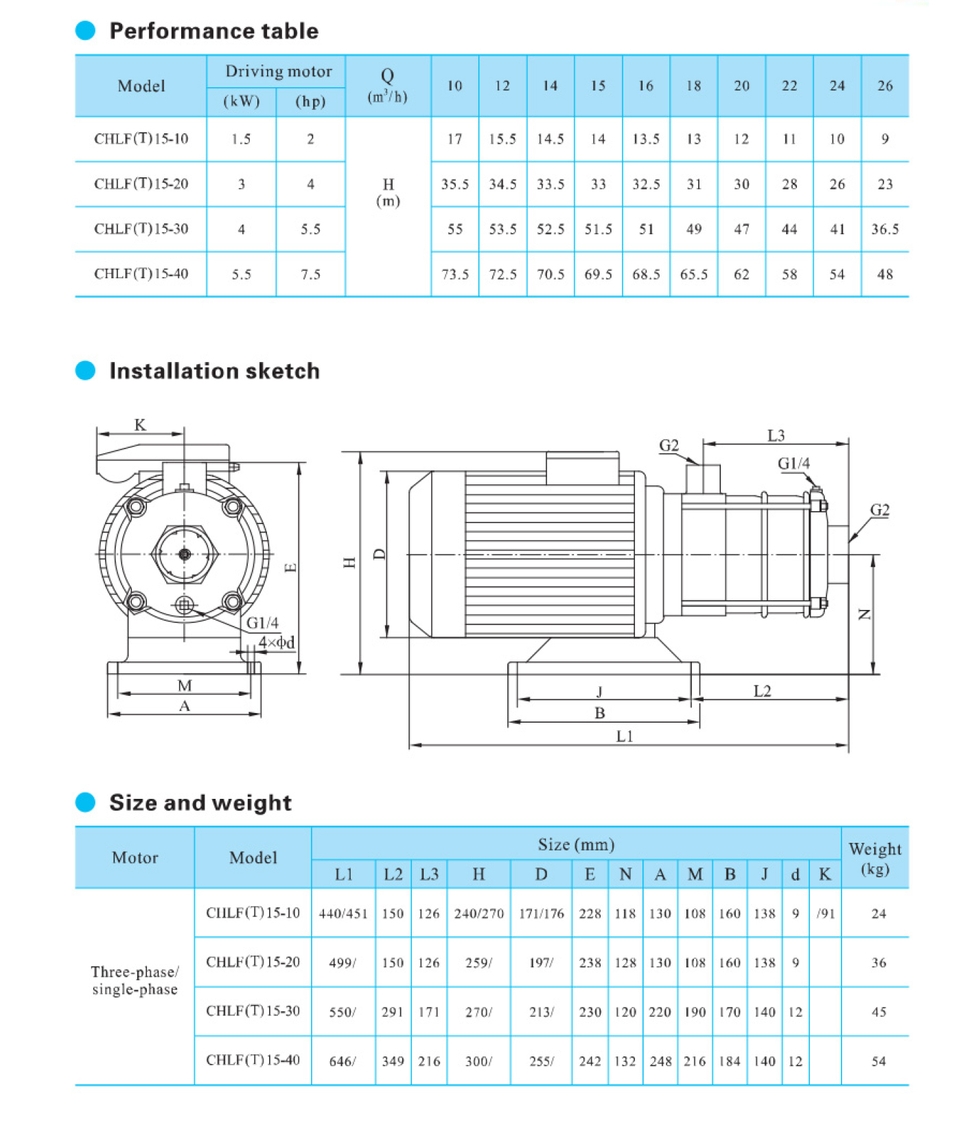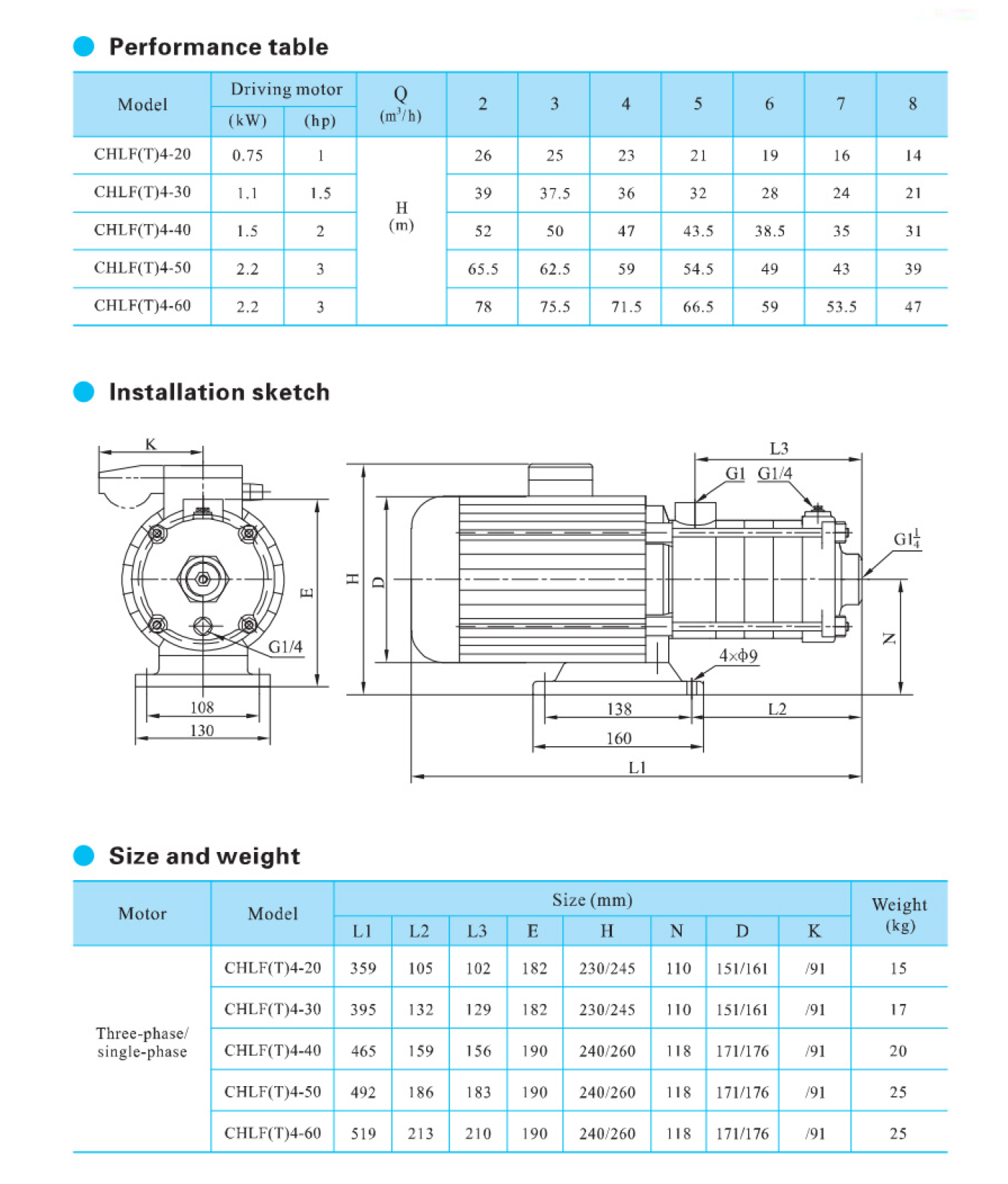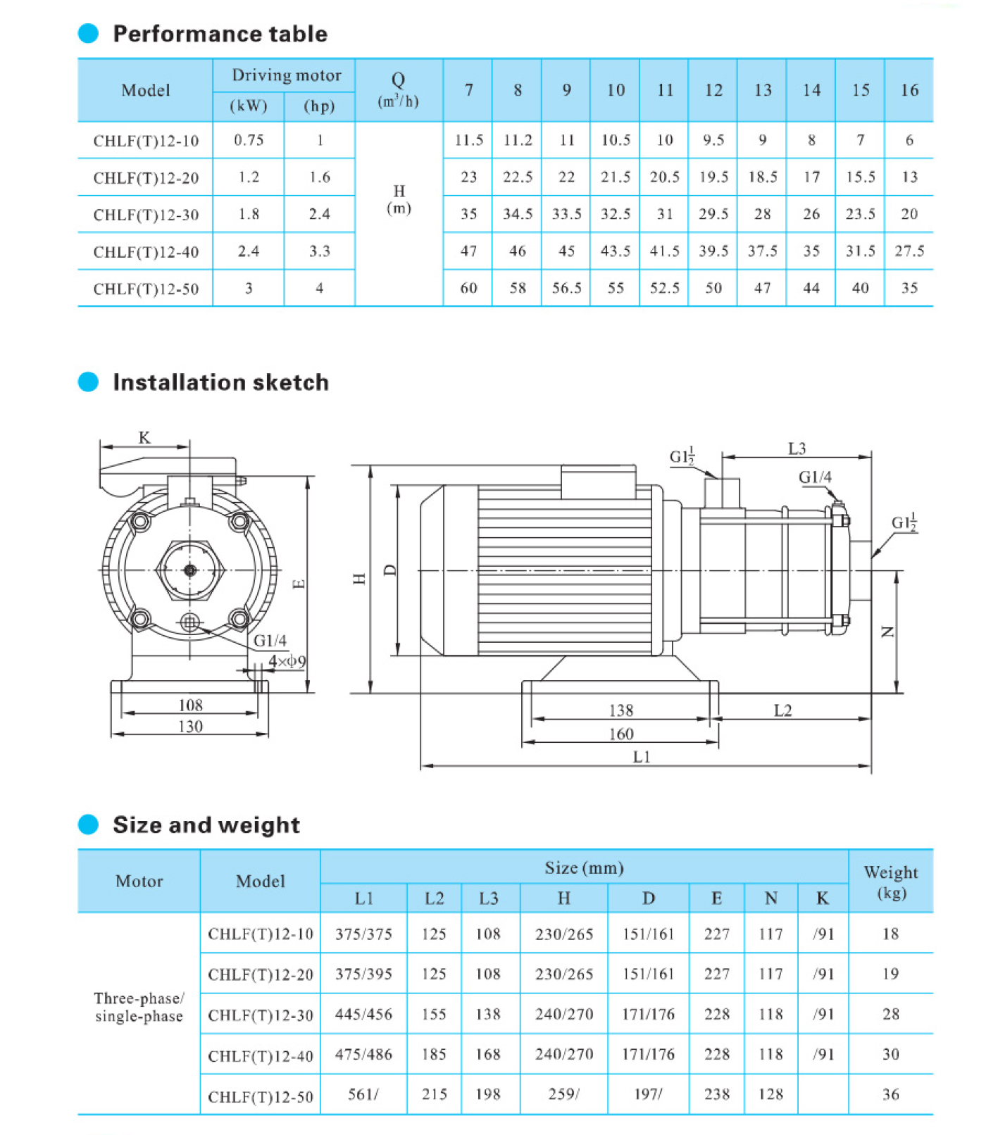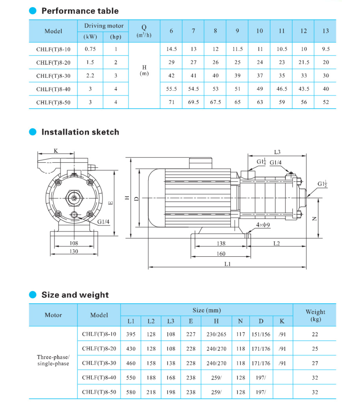 La pompe centrifuge multicellulaire horizontale en acier inoxydable à haut rendement de la série CHLF est équipée d'un moteur à arbre allongé horizontal, d'une aspiration axiale et d'une décharge radiale.